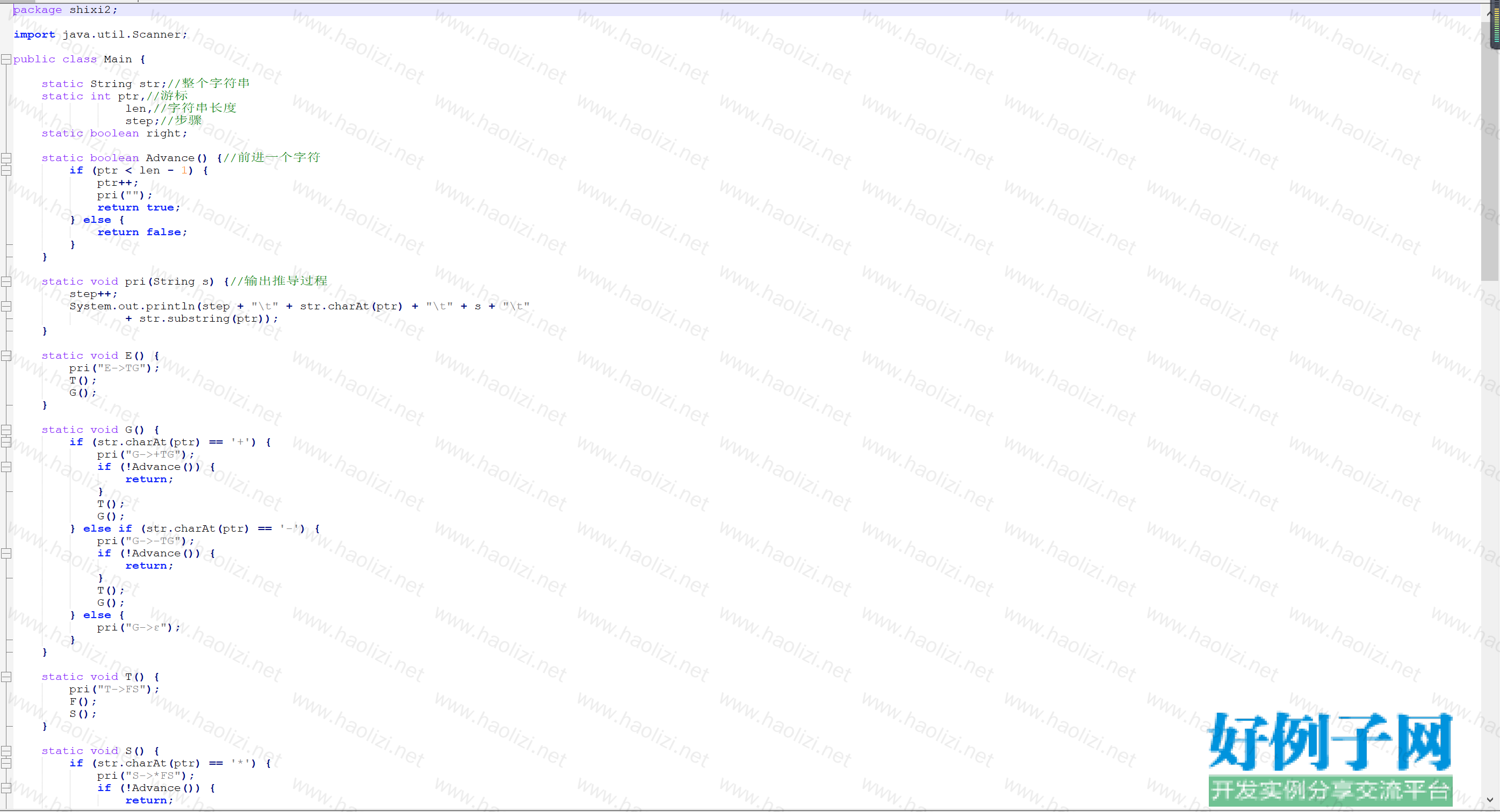 对于文法: E->TG G-> TG|-TG|ε T->FS S->*FS|/FS|ε F->(E)|i 用递归下降分析法对任意输入的符号串进行分析,输入输出参考main函数。